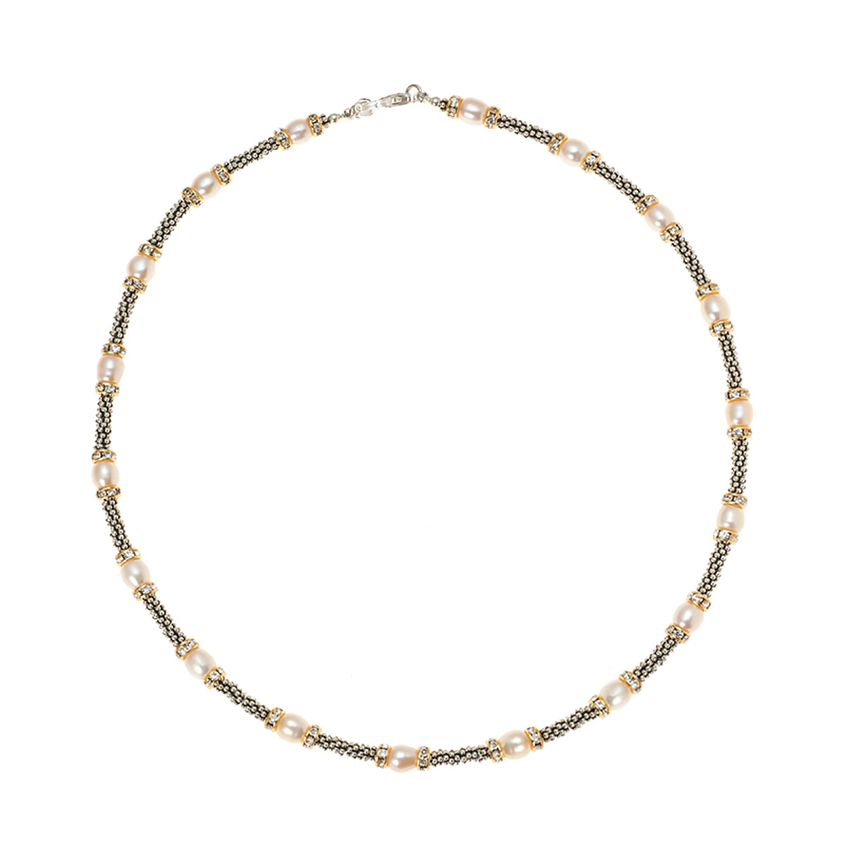 Made with Bali Sterling Silver, freshwater rice shaped pearls in natural white luster, and Swarovski crystal rondelles set in 18K Vermeil. This necklace is 17" and fastens with a small sterling silver lobster clasp. (Contact us if you need an alteration to the exact length of this piece.)