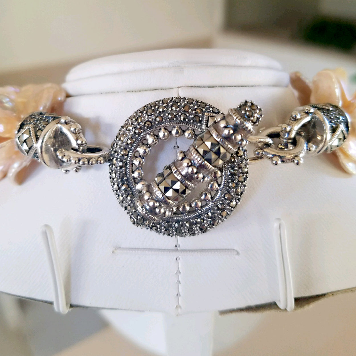 The finishing touch: A stunning clasp to complete the necklace. Our beautiful Signature Sterling Silver Marcasite Toggle Clasp is easy to fasten and will keep your necklace securely in place while making for a stunning final touch. Wear it in the back, as is traditionally done, or style it to the side or in the front for a slightly edgier look.