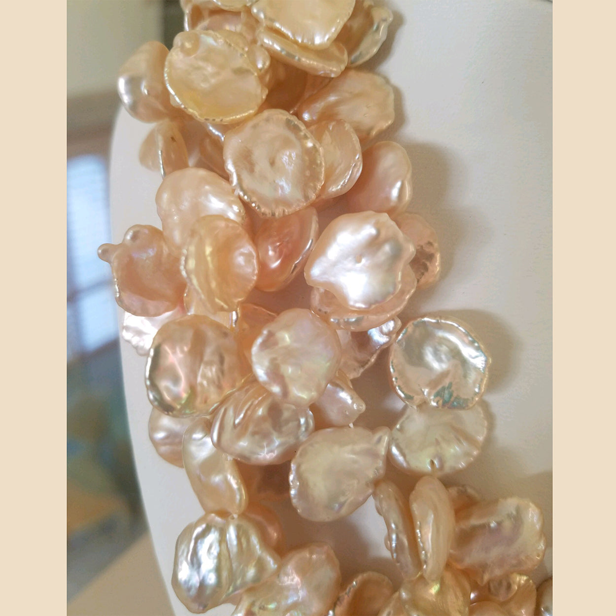 Limited Edition. Five strands of luscious Japanese Keshi Pearls in all natural "peachy" pink luster. Each delicate petal-shape pearl has a unique shape and a creamy satin finish. Together the natural beauty of these pearls is what sets this necklace apart. The quality of these Keshi pearls is the key to making this necklace the classic, sophisticated, timeless piece of jewelry that it is.